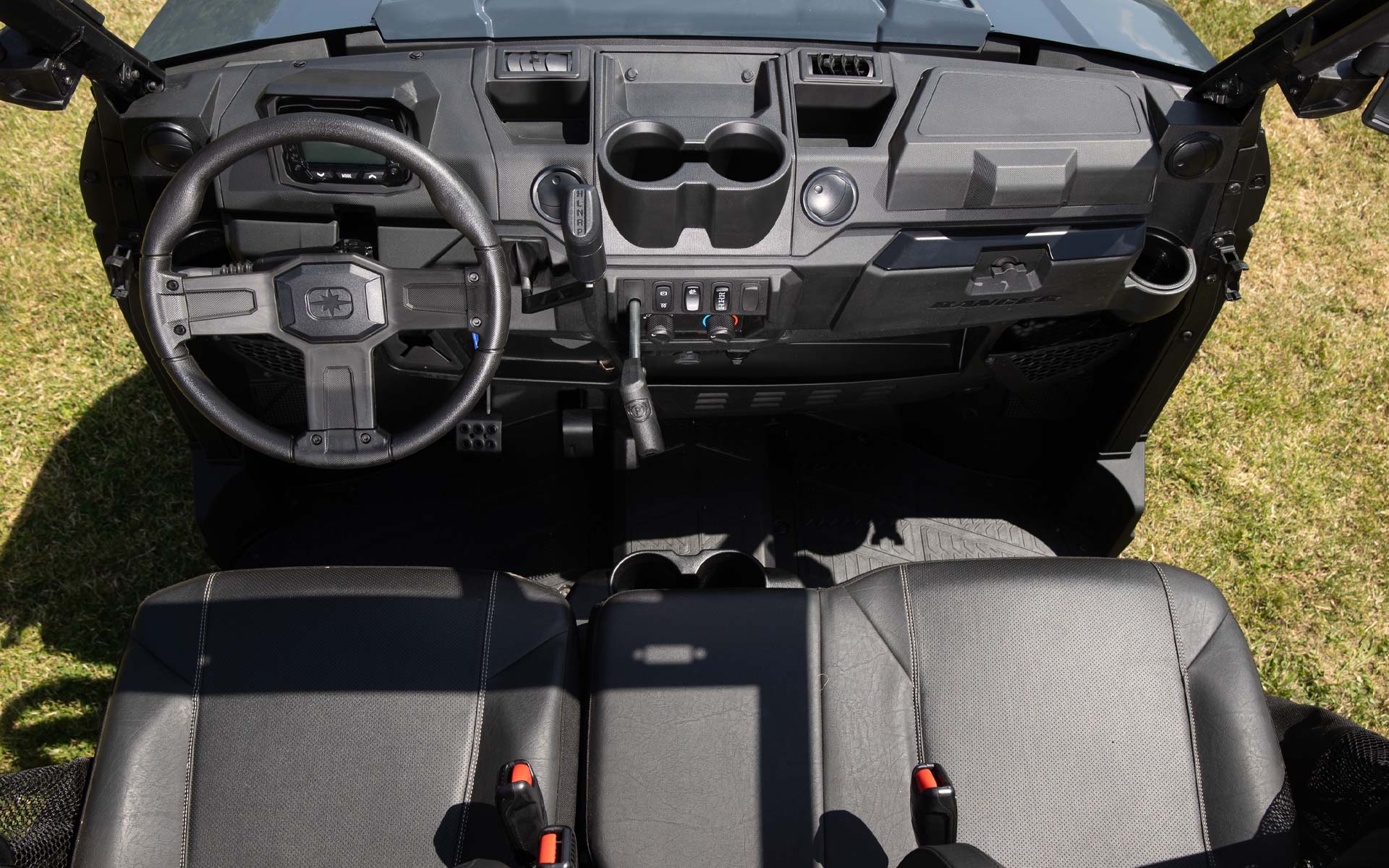 3-sitsigt soffsäte, 3-punktsbälten och justerbart förarsäte.